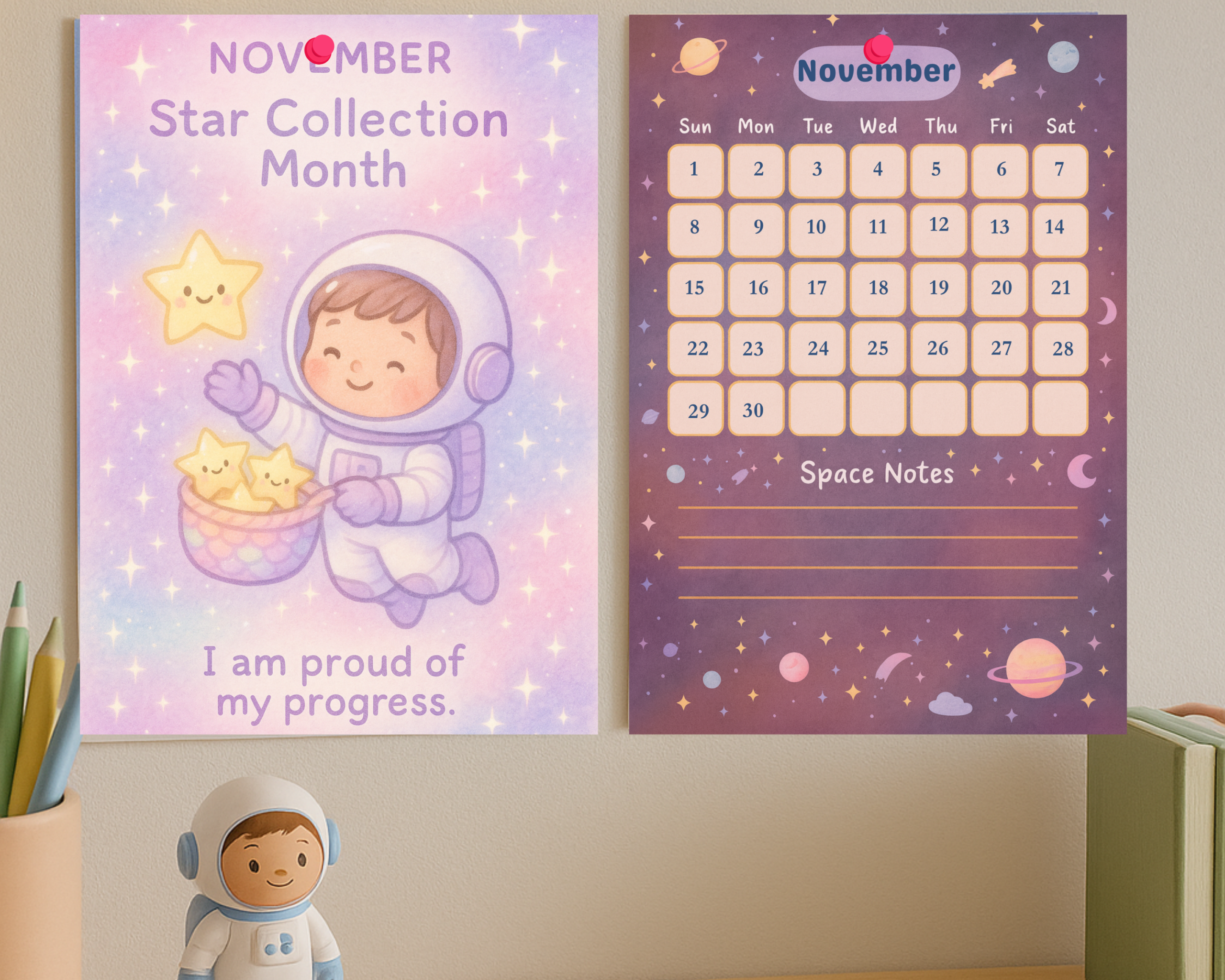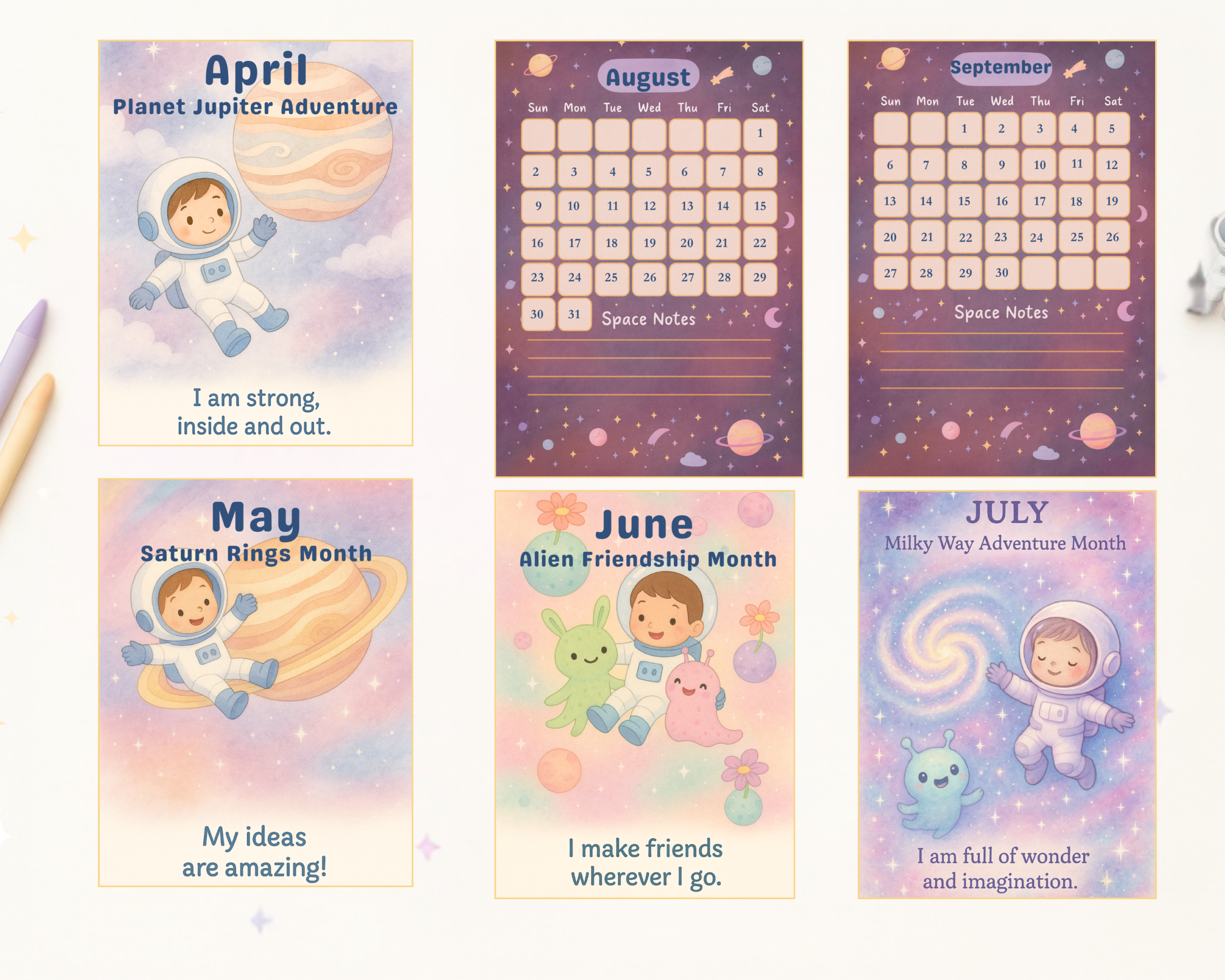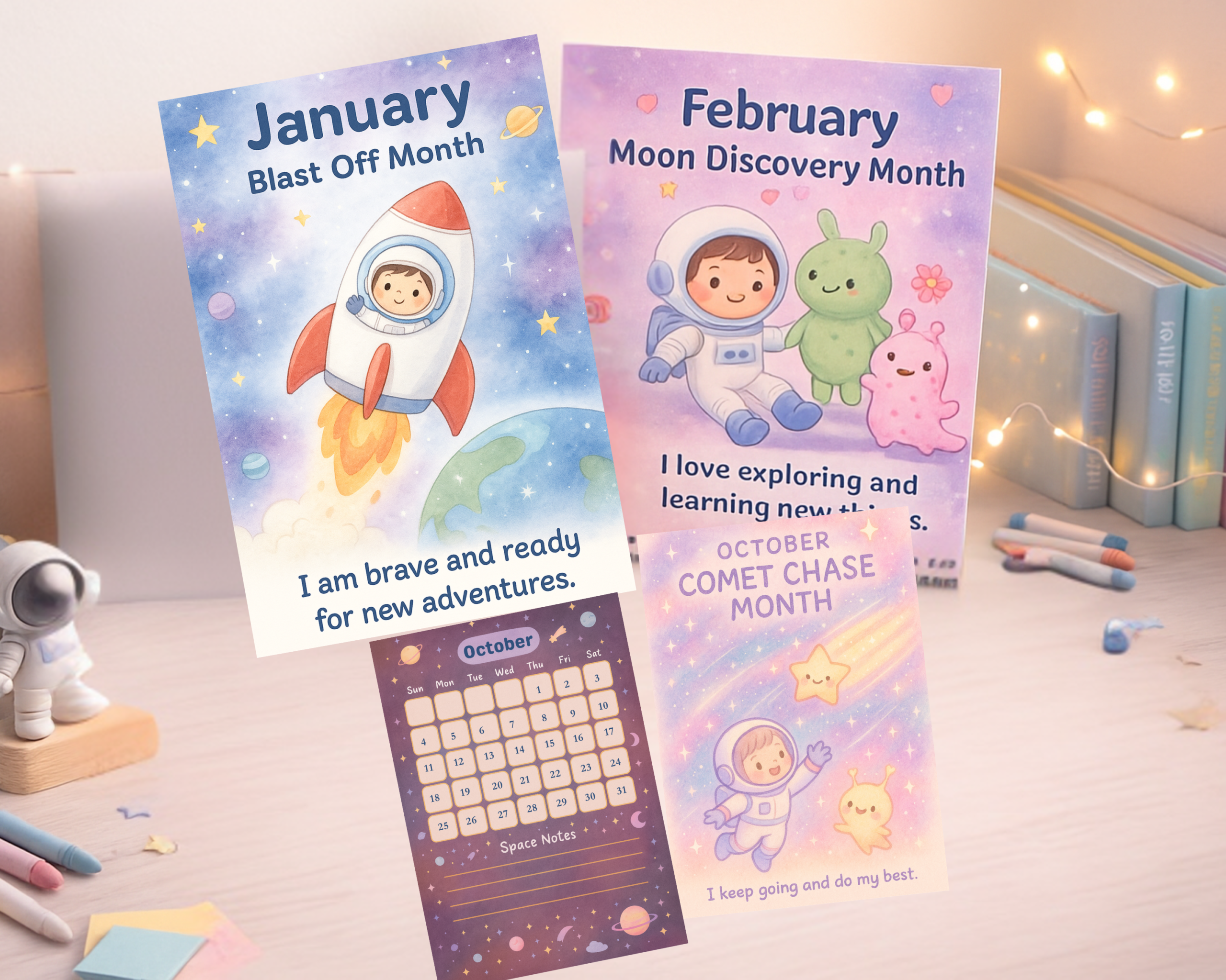 Perfect for little astronauts, classrooms, playrooms, and learning spaces, this pastel-themed printable calendar brings joy, imagination, and motivation to every month of the year.